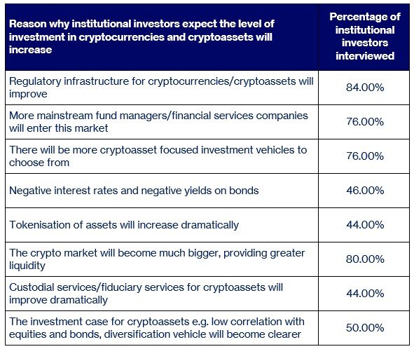 When asked why they believe institutional investors will increase their exposure to cryptocurrencies and cryptoassets, 84% of the survey respondents said it was because they expect the regulatory infrastructure for the market to improve, and this is followed by 80% who say it is because the crypto market will become much bigger, providing greater liquidity. Three in four (76%) say it is because they expect more mainstream fund managers and financial services companies to enter this market, and there will be more funds and investment vehicles in this area to choose from.